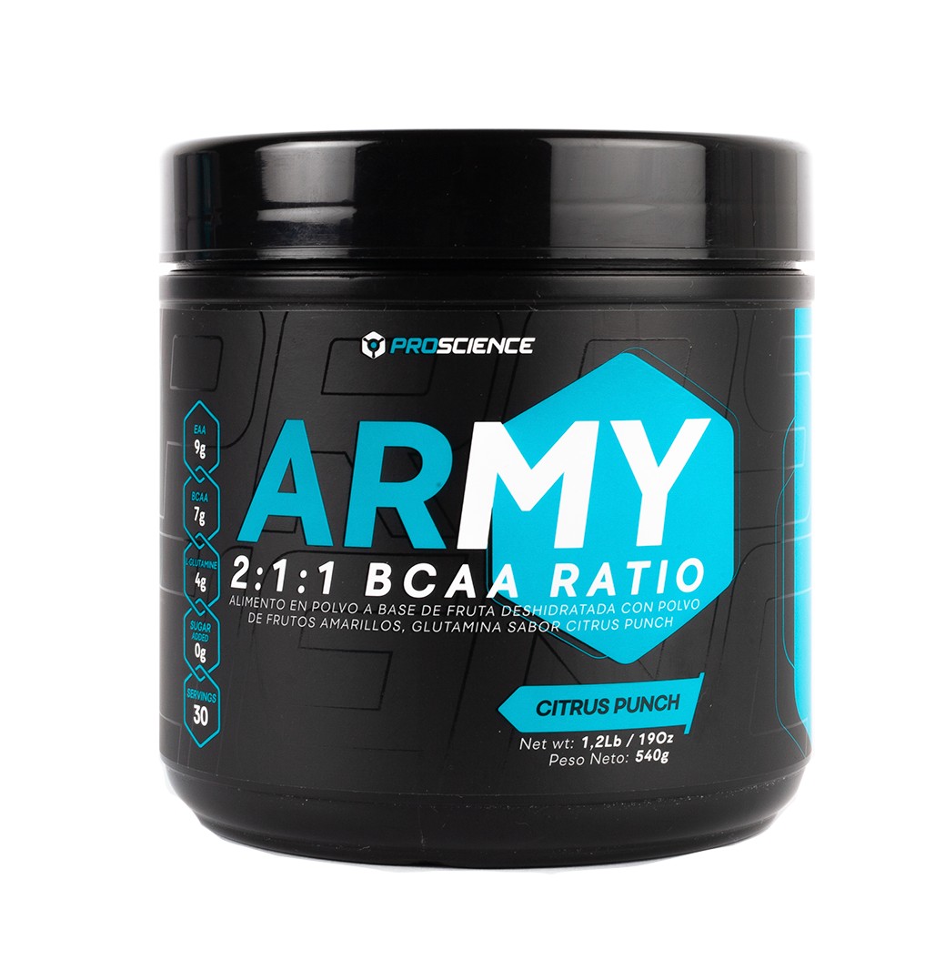 ARMY de ProScience es un Alimento en polvo a base de fruta deshidratada con polvo de frutos amarillos, glutamina.