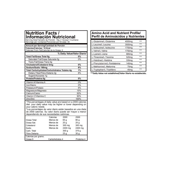 Ingredientes: Polvo Deshidratado de Frutos Amarillos, L-Glutamina, L-Leucina, L-Isoleucina, L- Valina, L-Lisina, L-Treonina, L-Histidina, L-Fenilalanina, L-Metionina, L-Triptófano, Carboximetilcelulosa (CMC),Fosfato Tricálcico, Saborizante idéntico al Natural, Vitamina C(ÁcidoAscórbico), Stevia,Citrato de Sodio, Citrato de Potasio, Ácido Málico, Dióxido de Silicio, Colorante (Amarillo), Citrato de Magnesio, Gluconato de Zinc.